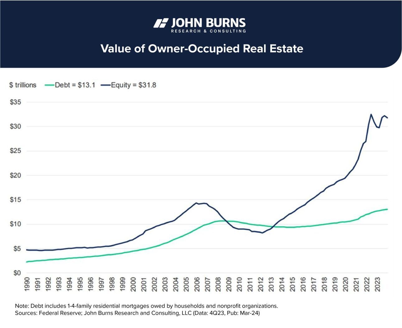 Homeowners are sitting on nearly $32 trillion in home equity, according to Sean Wong of John Burns Research and Consulting. This is more than double the $15 trillion peak in 2006, which was the byproduct of the most fraudulent housing market in American history.